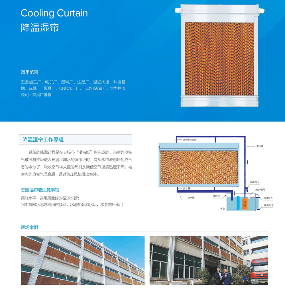 铝合金降温水帘外框要优于镀锌板外框,使用年限要高很多。降温水帘(湿帘)是一种特种纸蜂窝结构材料,其工作原理是“水蒸发吸收热量”这一自然物理现象,即水在重力的作用下,从上往下流,在水帘(湿帘)波纹状的纤维表面形成水膜,当空气流动经过水,水膜中的水帘(湿帘)时,水膜中的水会蒸发吸收空气中的热量带走大量的热,使经过水帘(湿帘)的空气温度下降,从而达到降温的目的。