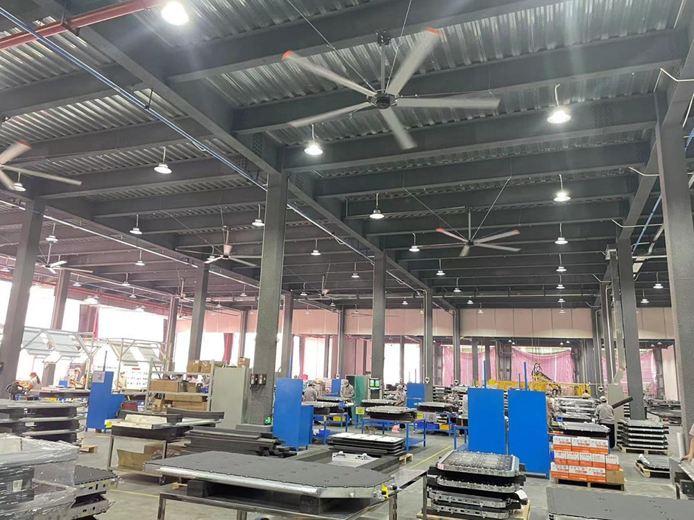 原有小风扇无法解决问题,工厂原以为有了行车不能安装吊扇,车间的通风降温一直是困扰工厂管理层的问题。 鸿博通过现场实地了解情况,结合厂房面积,设备布局, 人员分布情况, 在300*100米厂房里优化布局7米3工业吊扇。